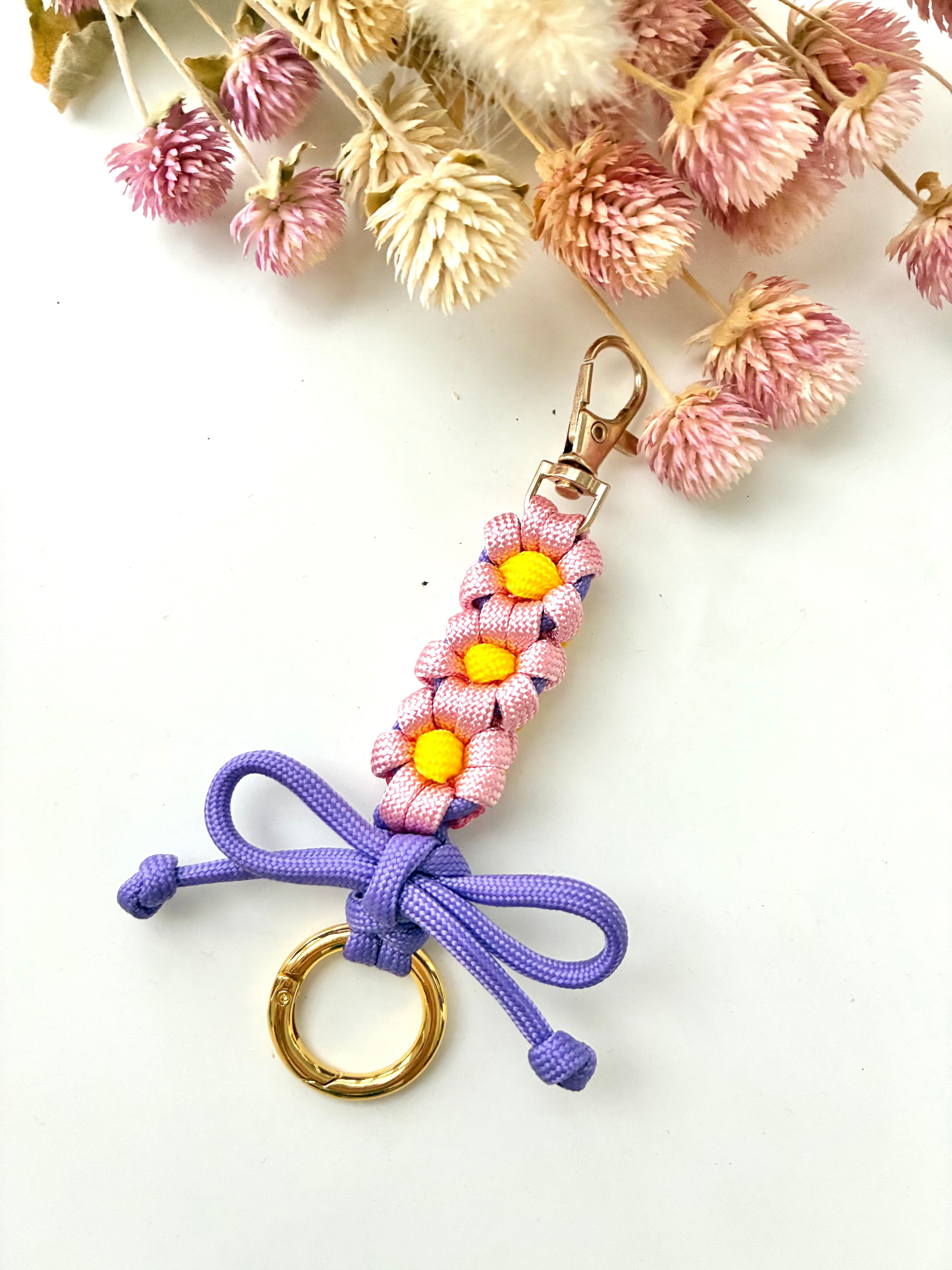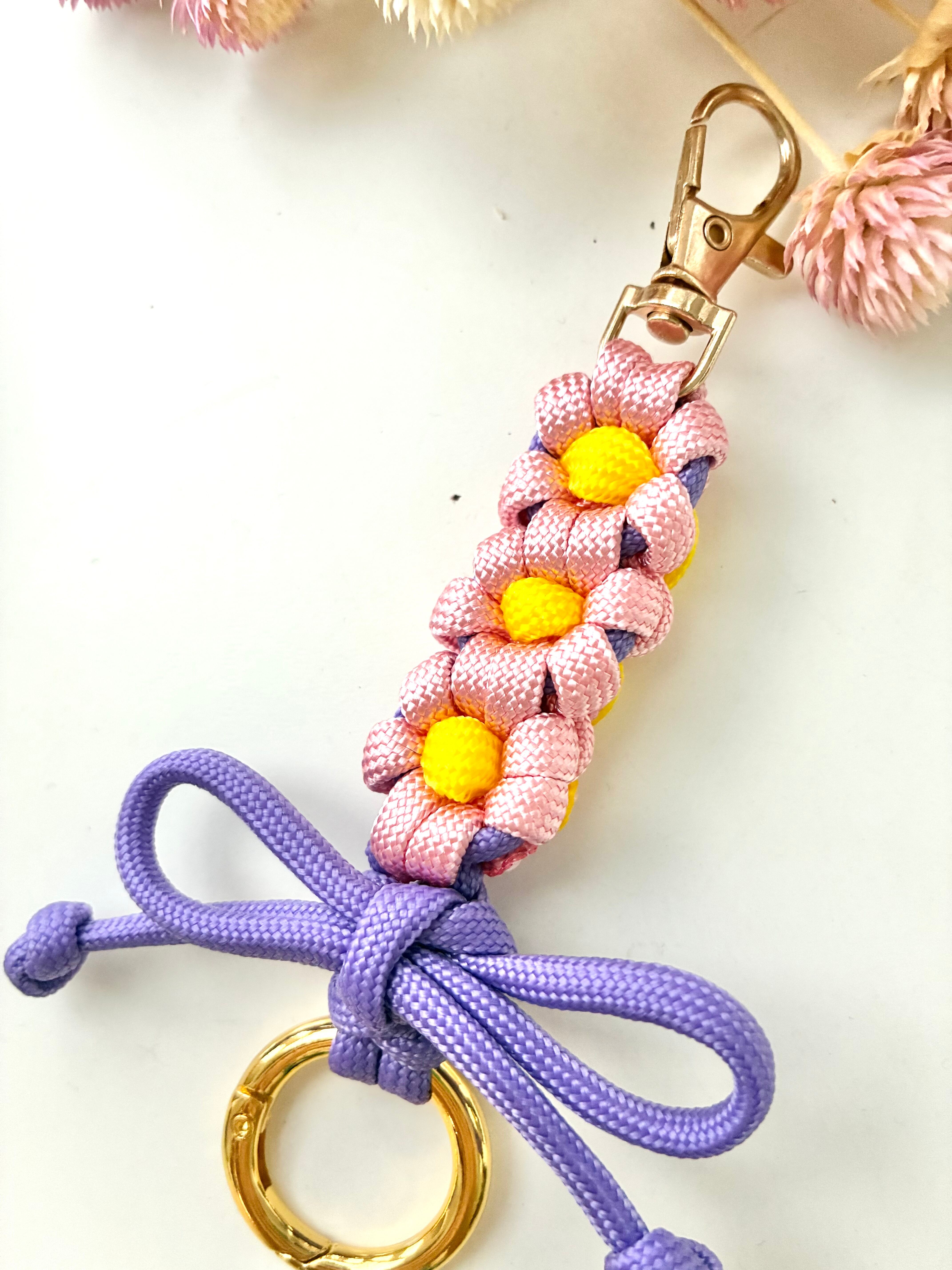 パラコードで作ったお花のキーホルダーです。下側にもカナビラを付けていますので、繋げて使う事も可能です。