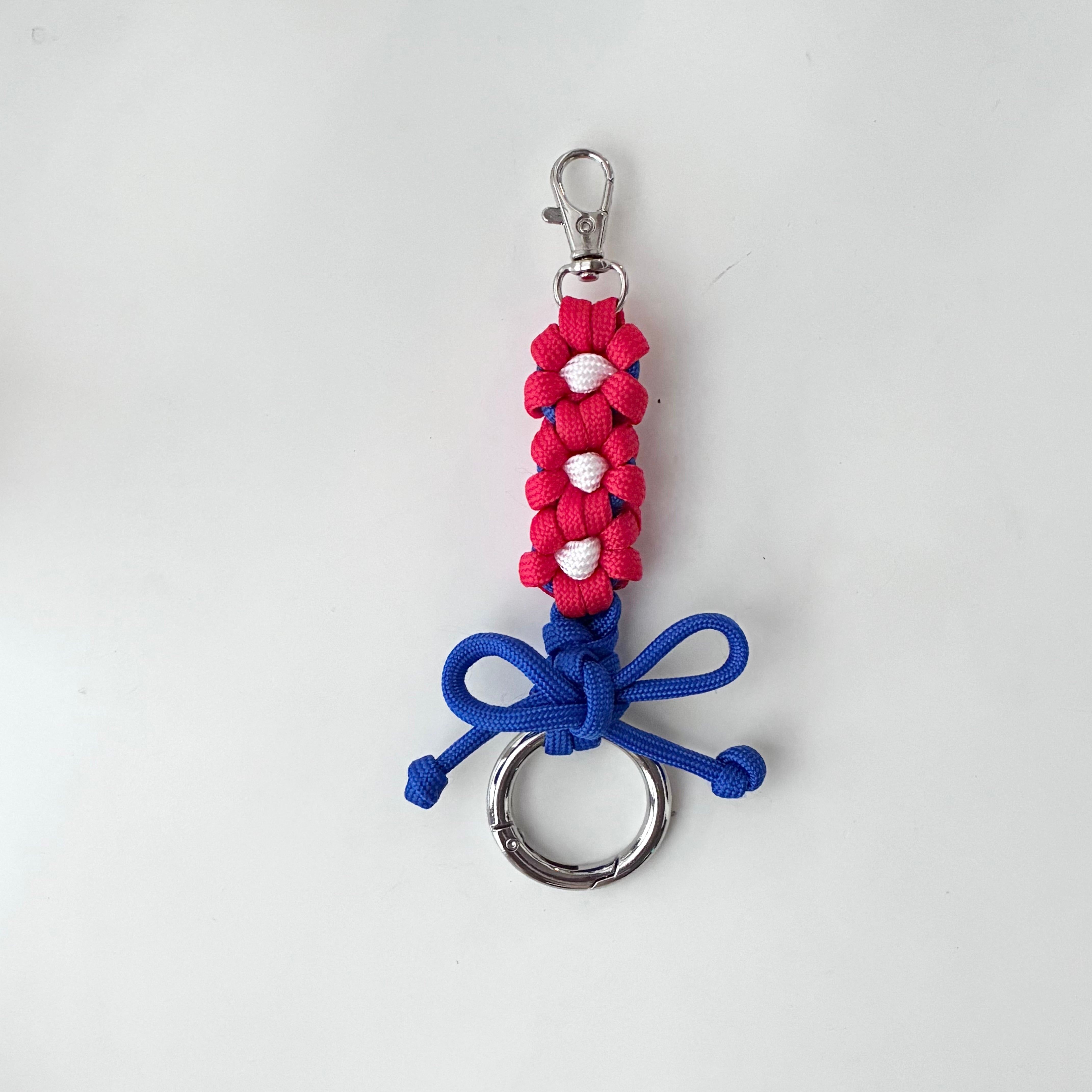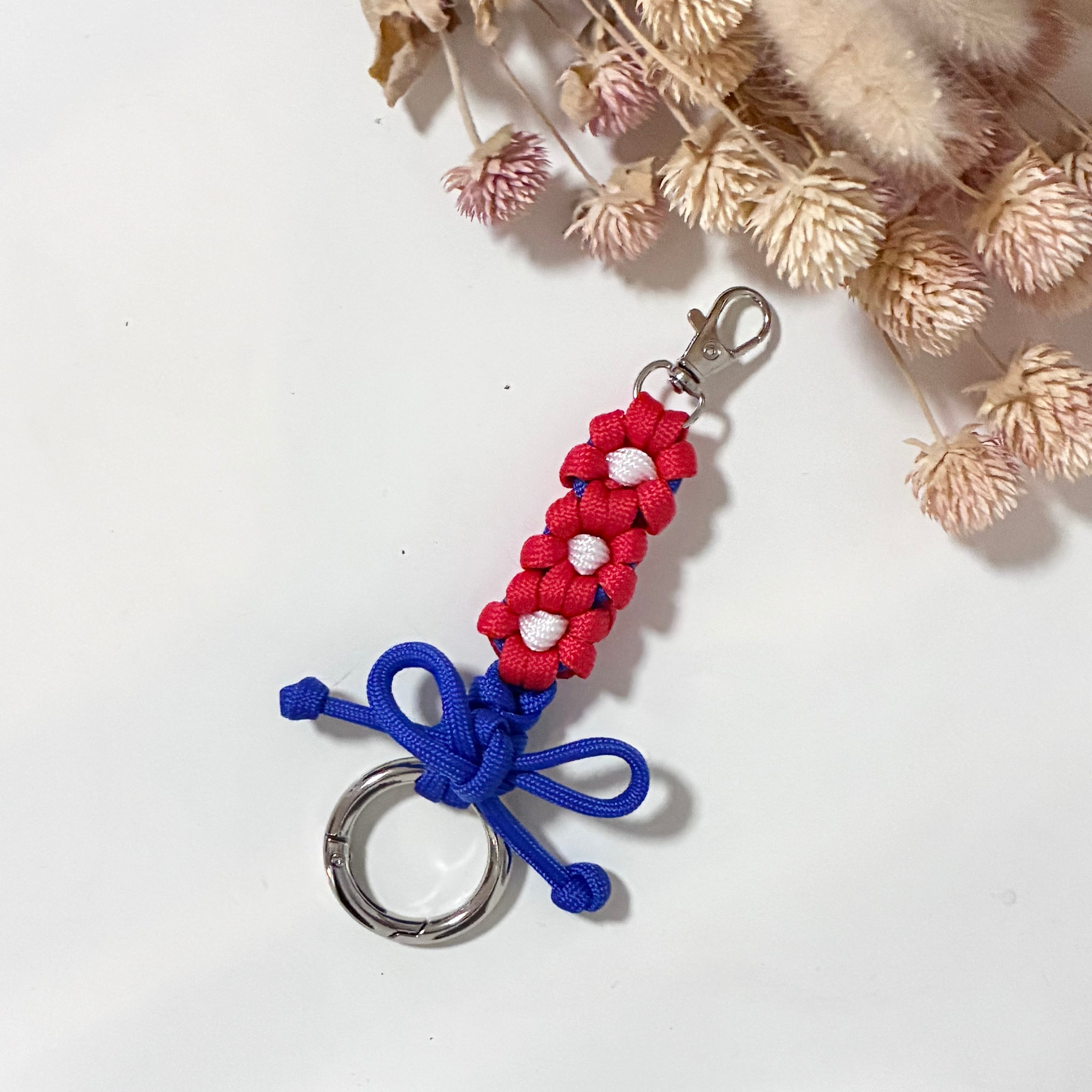 パラコードで作ったお花のキーホルダーです。下側にもカナビラを付けていますので、繋げて使う事も可能です。