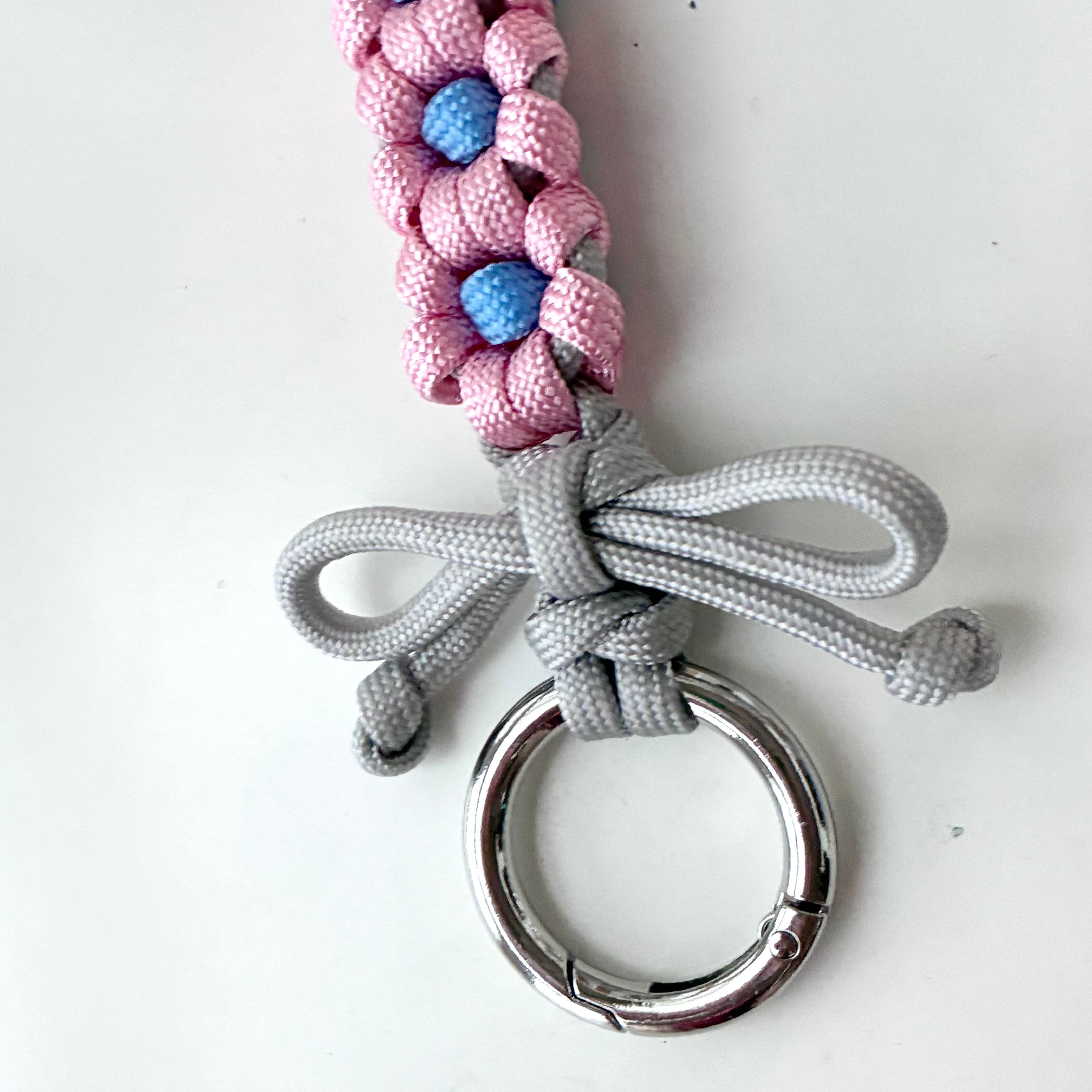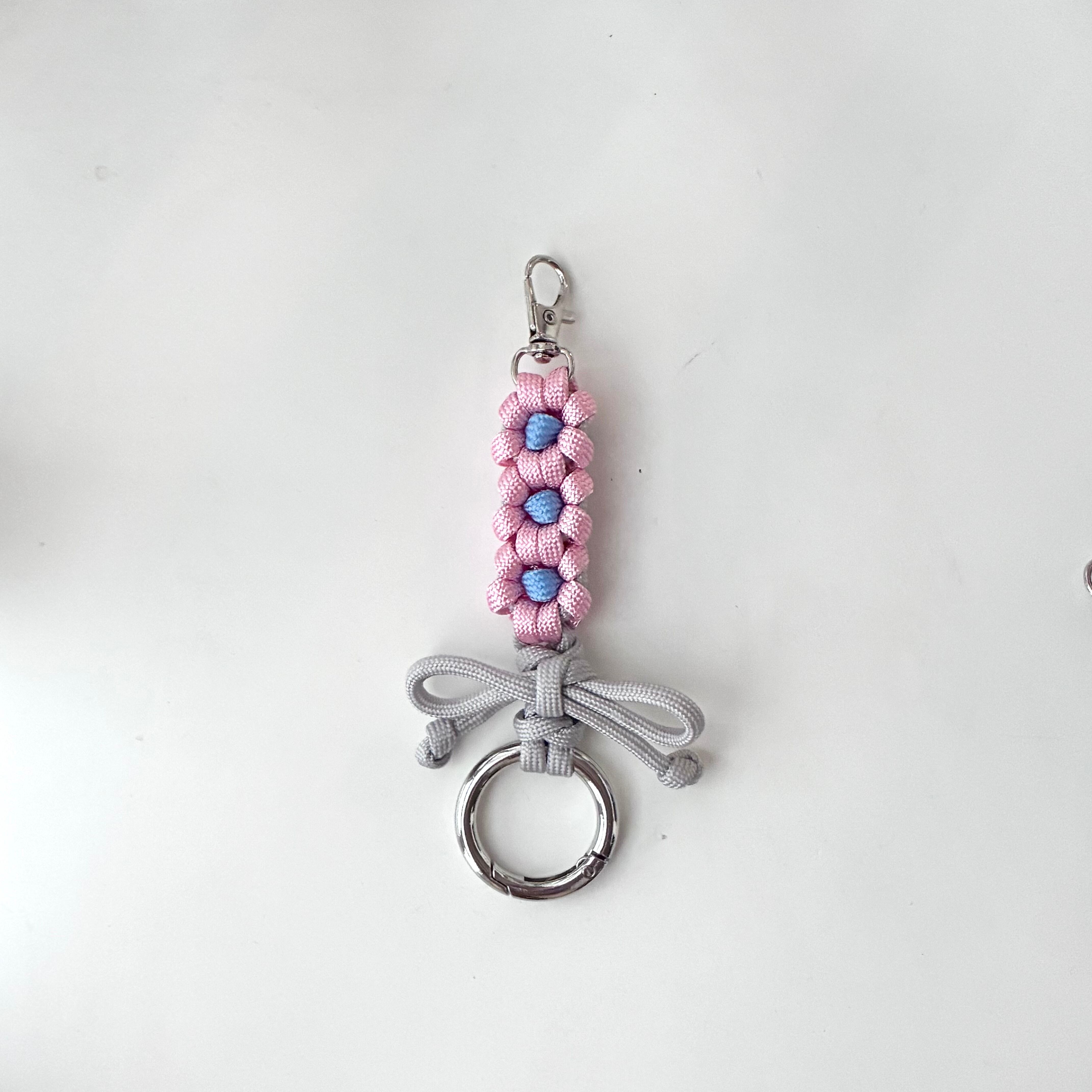 パラコードで作ったお花のキーホルダーです。下側にもカナビラを付けていますので、繋げて使う事も可能です。