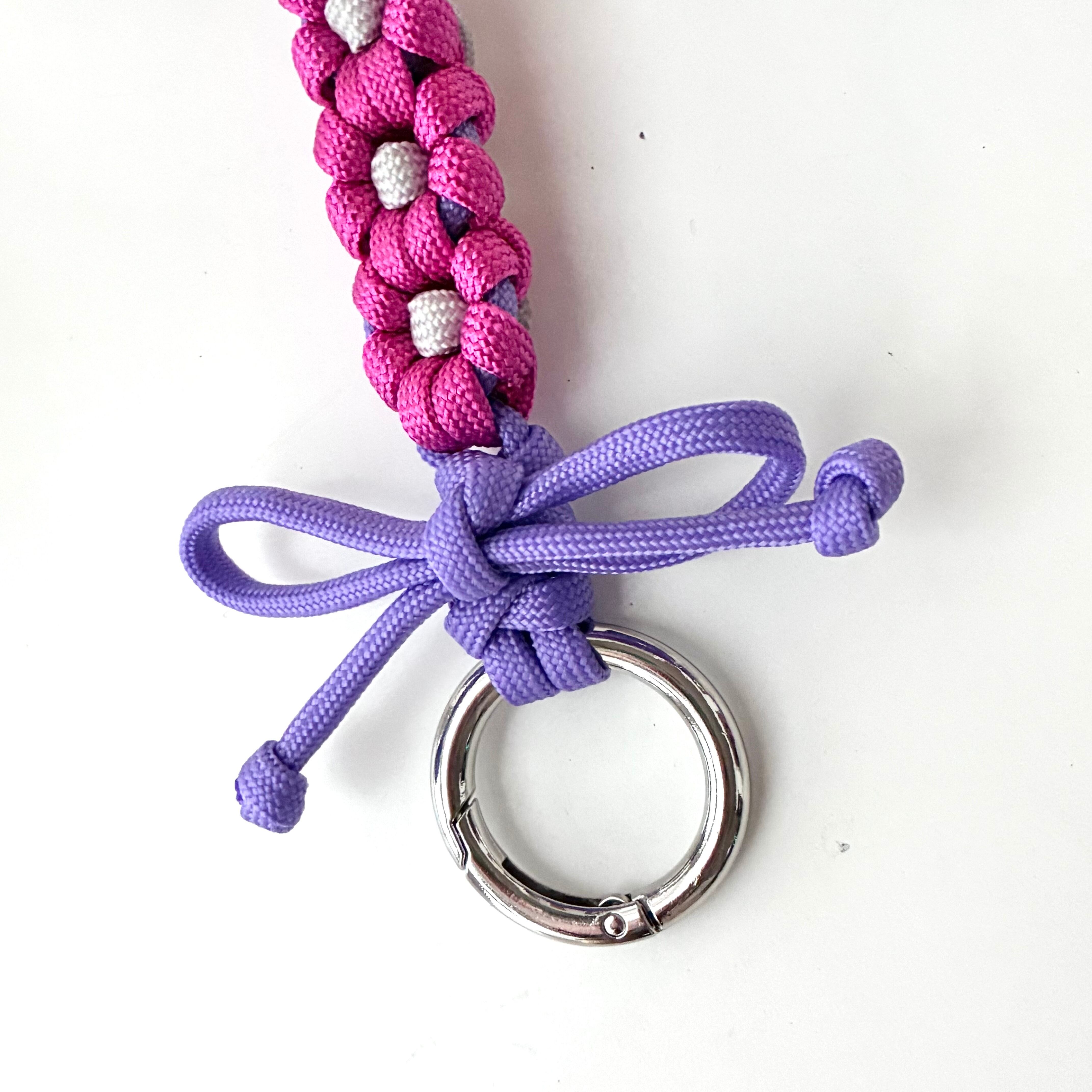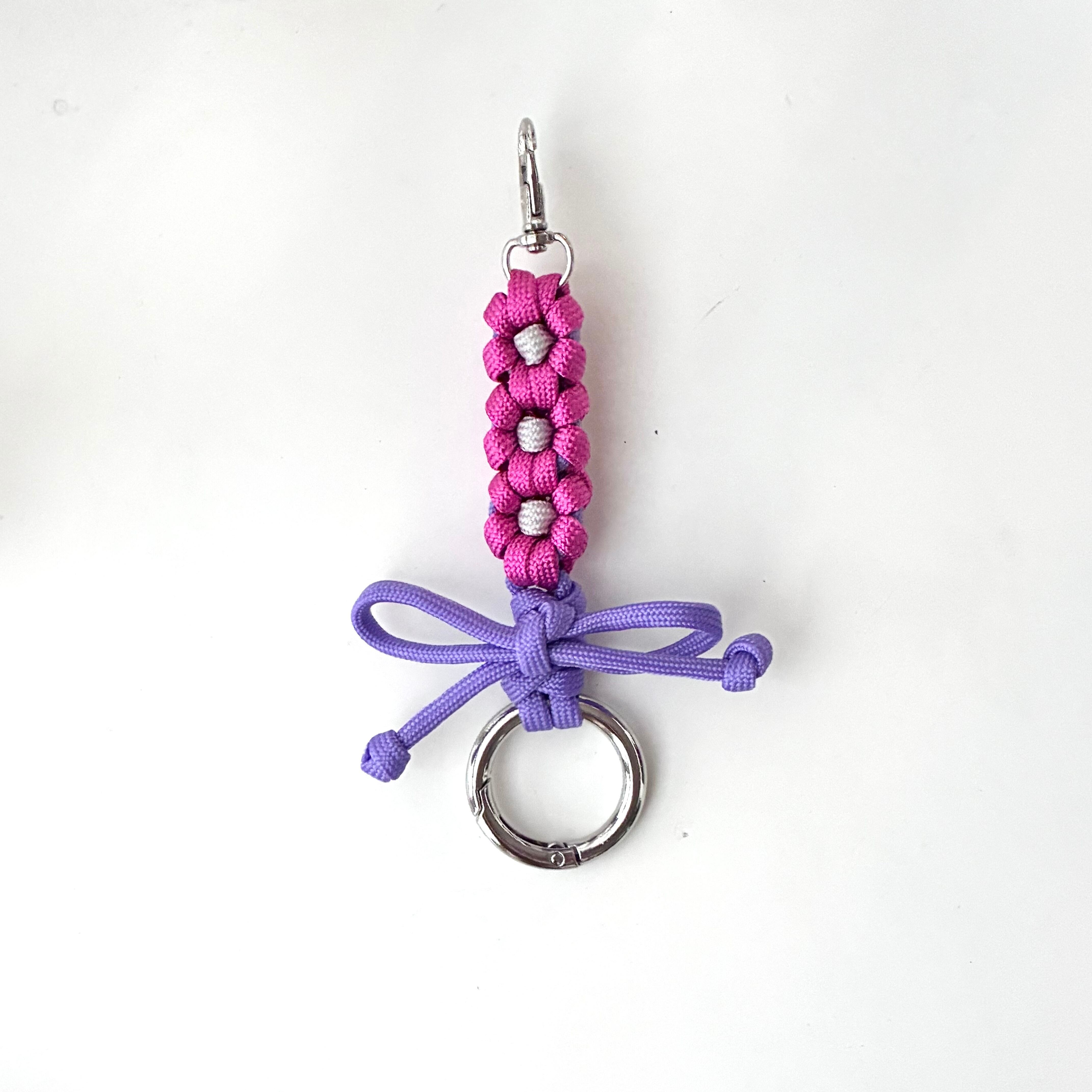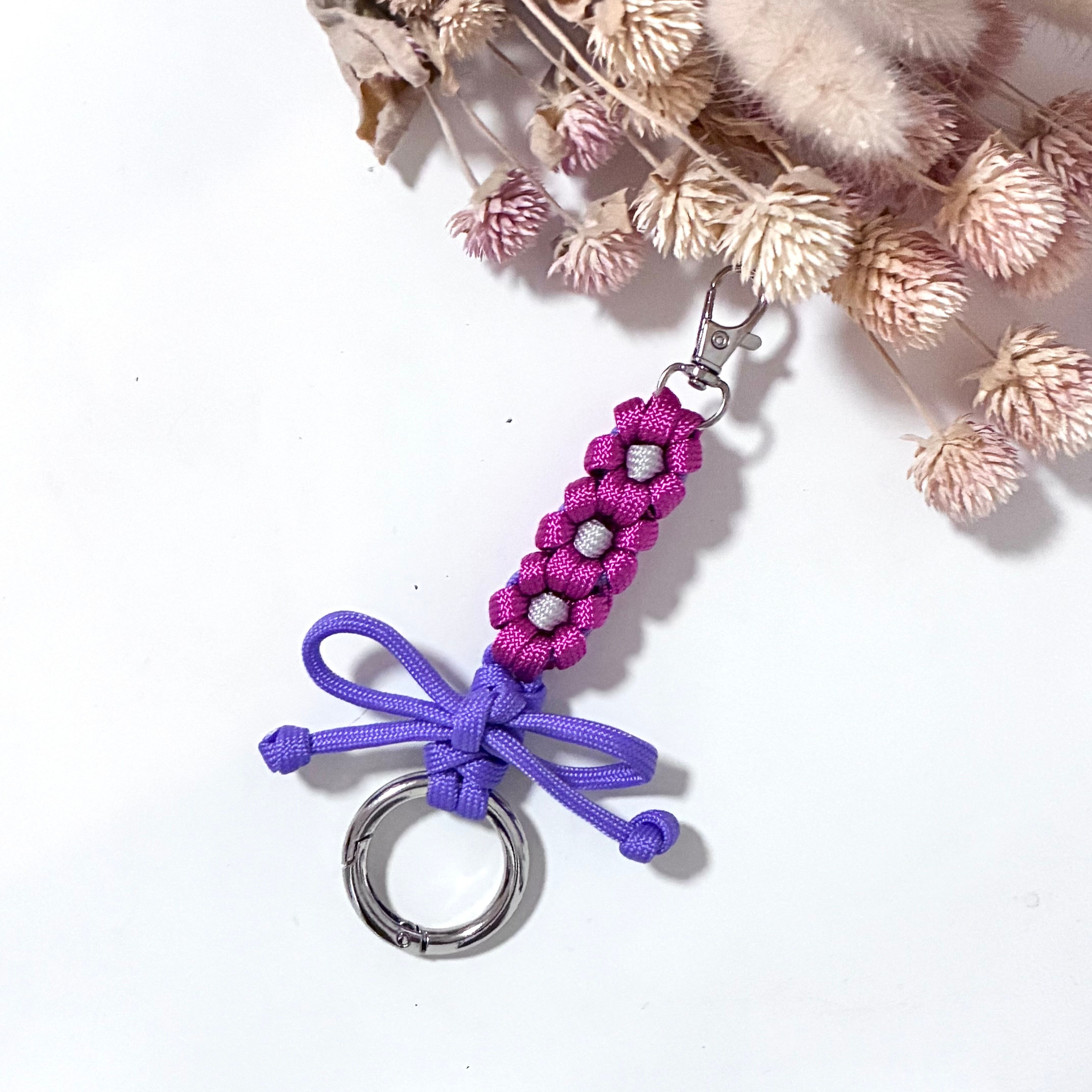 パラコードで作ったお花のキーホルダーです。下側にもカナビラを付けていますので、繋げて使う事も可能です。