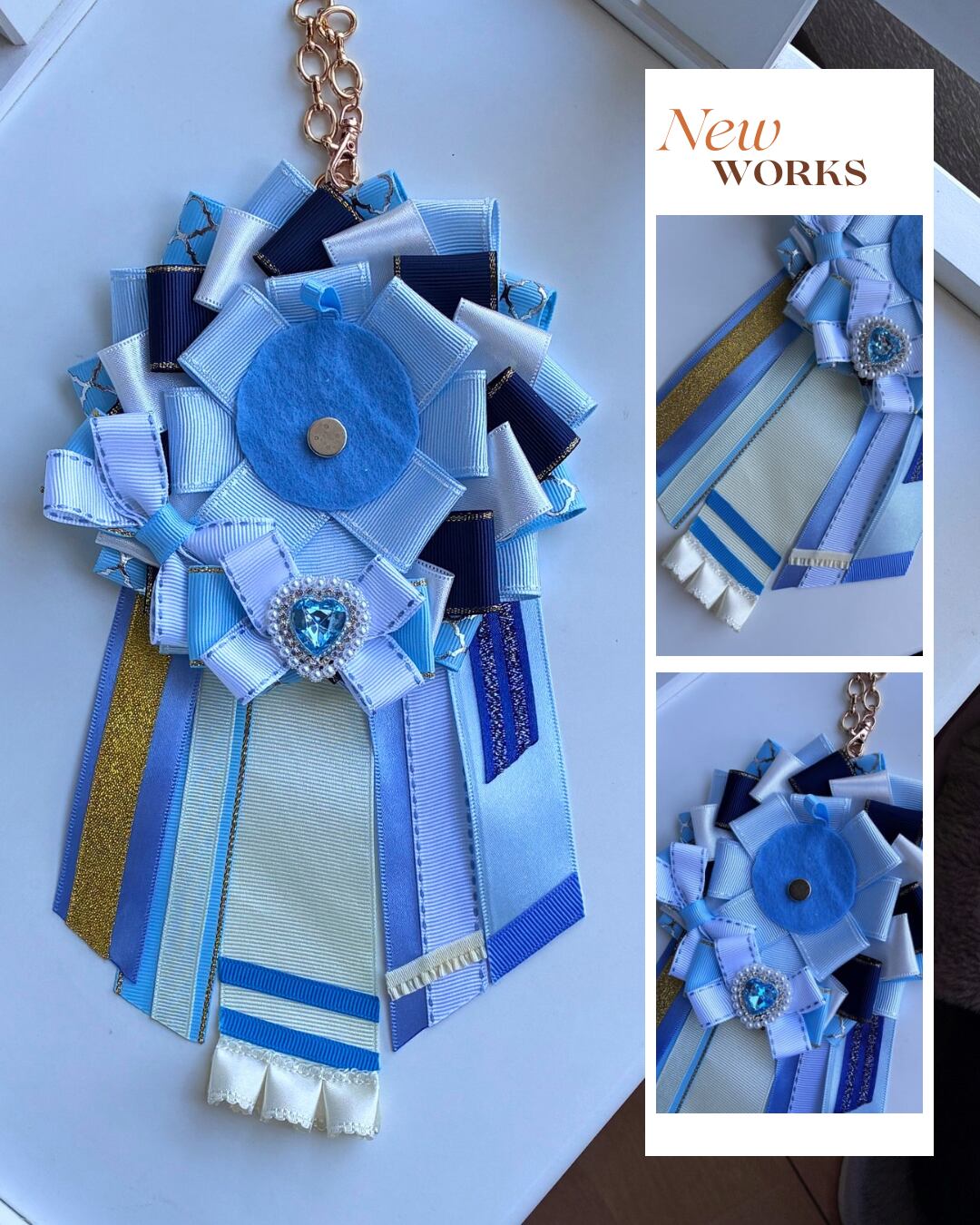 ブルー系、水色系の痛ロゼットです。ほぼ水色系のリボンを使い、濃い青が良いアクセントになっています!明るく可愛いリボンが2つ付いているのも特徴です!下の部分もたくさんの種類の青を使いました!