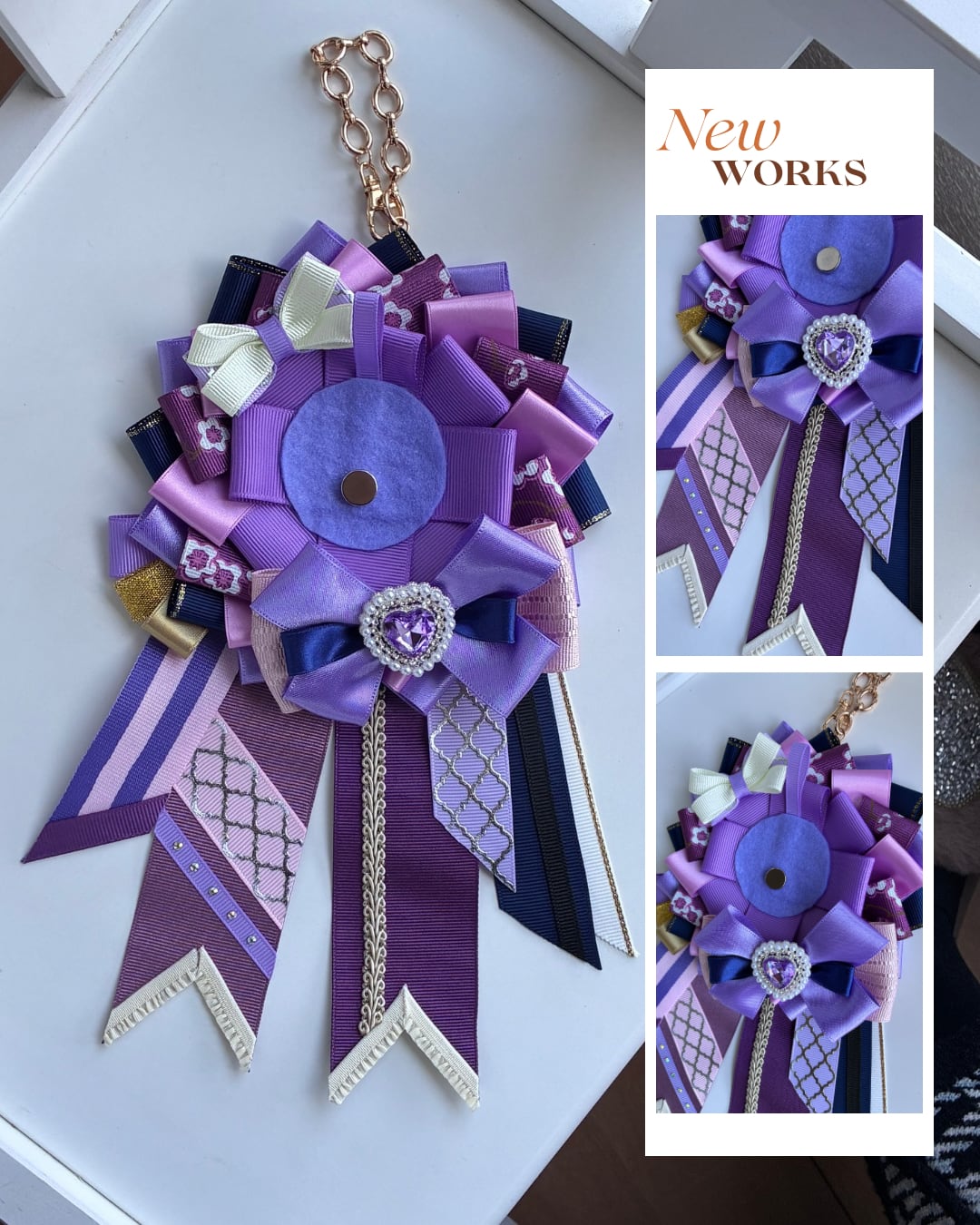 ロゼットに柄付きのリボンが入り、良いアクセントになっています!パープルの中にピンクを入れることで明るくなっています。重ねたリボンや、左横の金色の部分が豪華さを出しています!