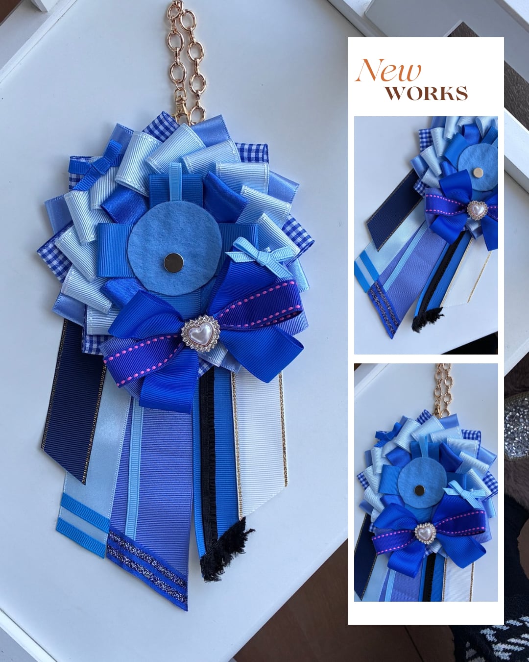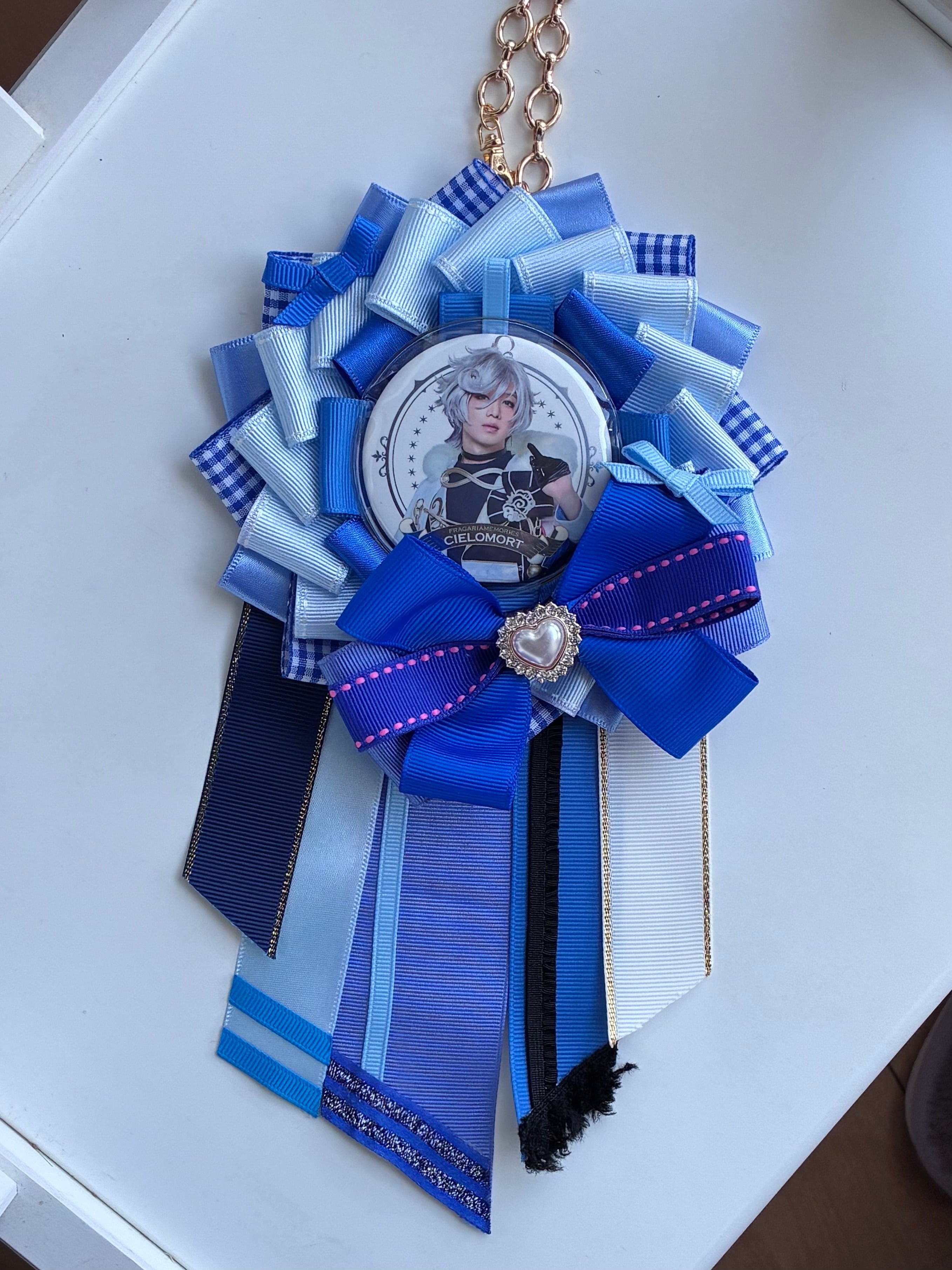 ブルー系のロゼットです!大きなリボンが特徴で、小さなリボが着いているのも可愛いポイントです!下には濃いめのリボンを付けることで、落ち着いた雰囲気も出しています。斜めに切ったリボンや重ねたリボンが豪華さを出しています!